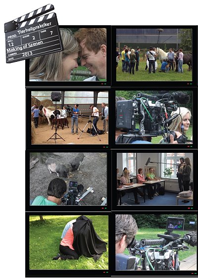 Am dritten Drehtag wurde der Hof dann zum richtigen Lehrhof, als 10 THP-Studentinnen und -Studenten sowie THP-Dozent Dirk Röse praktischen Unterricht durchführten. Hierbei präparierte Herr Röse in seiner unnachahmlichen Art einen Weideunfall beim Pferd und überraschte die ahnungslosen Studentinnen und Studenten mit dieser „Notfallsituation“.